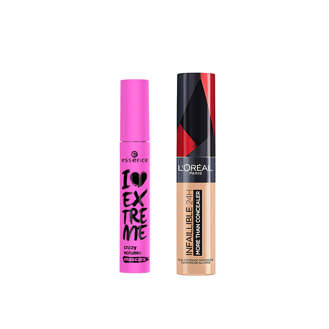 Upgrade your look with a perfect offer combining Essence I Love Extreme Mascara for bold, voluminous lashes, and L'Oréal Infallible Concealer for smooth, flawless coverage.